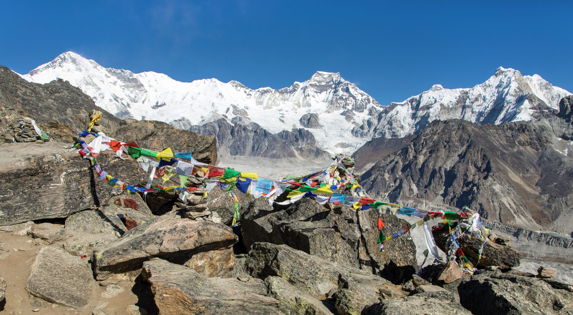Pierwszy pięciotysięcznik na naszej trasie. Położony nad jeziorami Gokyo i największym lodowcem w Nepalu, zachwyca niesamowitymi widokami. Z jego wierzchołka rozciąga się panorama na cztery ośmiotysięczniki: Mount Everest, Lhotse, Makalu and Cho Oyu. Na szczycie na wietrze trzepoczą kolorowe flagi modlitewne –„lungta”. Ich nazwa oznacza dosłownie „koń-wiatr”, jest to symbol niesienia modlitw ku niebu. Każdy kolor ma swoje znaczenie: niebieski to niebo, biały – powietrze, czerwony – ogień, zielony – woda, a żółty – ziemia. Razem tworzą harmonię pięciu żywiołów, podstaw równowagi we wszechświecie. Wydrukowane na nich mantry, sylaby i wizerunki bóstw mają przynosić błogosławieństwo nie tylko temu, kto je rozwiesza, ale wszystkim istotom – niezależnie od wiary czy pochodzenia.