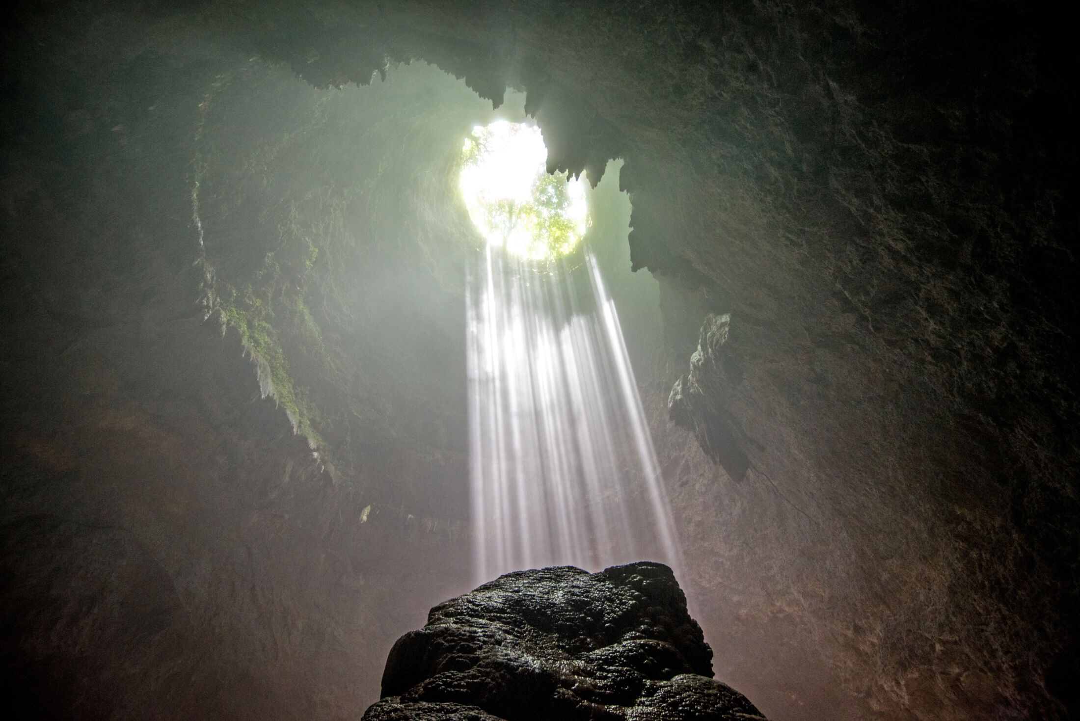 Jaskinia Jomblang to tzw. jaskinia zawaliskowa (pionowa), która powstała w wyniku zawalenia się stropu nad podziemną komorą. Powstał wówczas charakterystyczny otwór o średnicy kilkudziesięciu metrów. Zwiedzanie rozpoczyna się od emocjonującego zjazdu na linach w głąb jaskini, by na jej dnie podziwiać wyjątkowy efekt promieni słonecznych wpadających wnętrza.