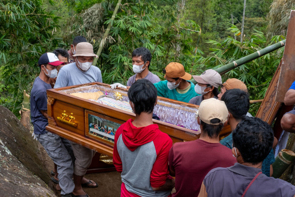 Po zakończeniu ceremonii ciało składane jest w charakterystycznych miejscach pochówku – w wykutych w skałach grobach lub w specjalnych niszach skalnych. Często towarzyszą im drewniane figury tau tau, przedstawiające zmarłych i „czuwające” nad okolicą.