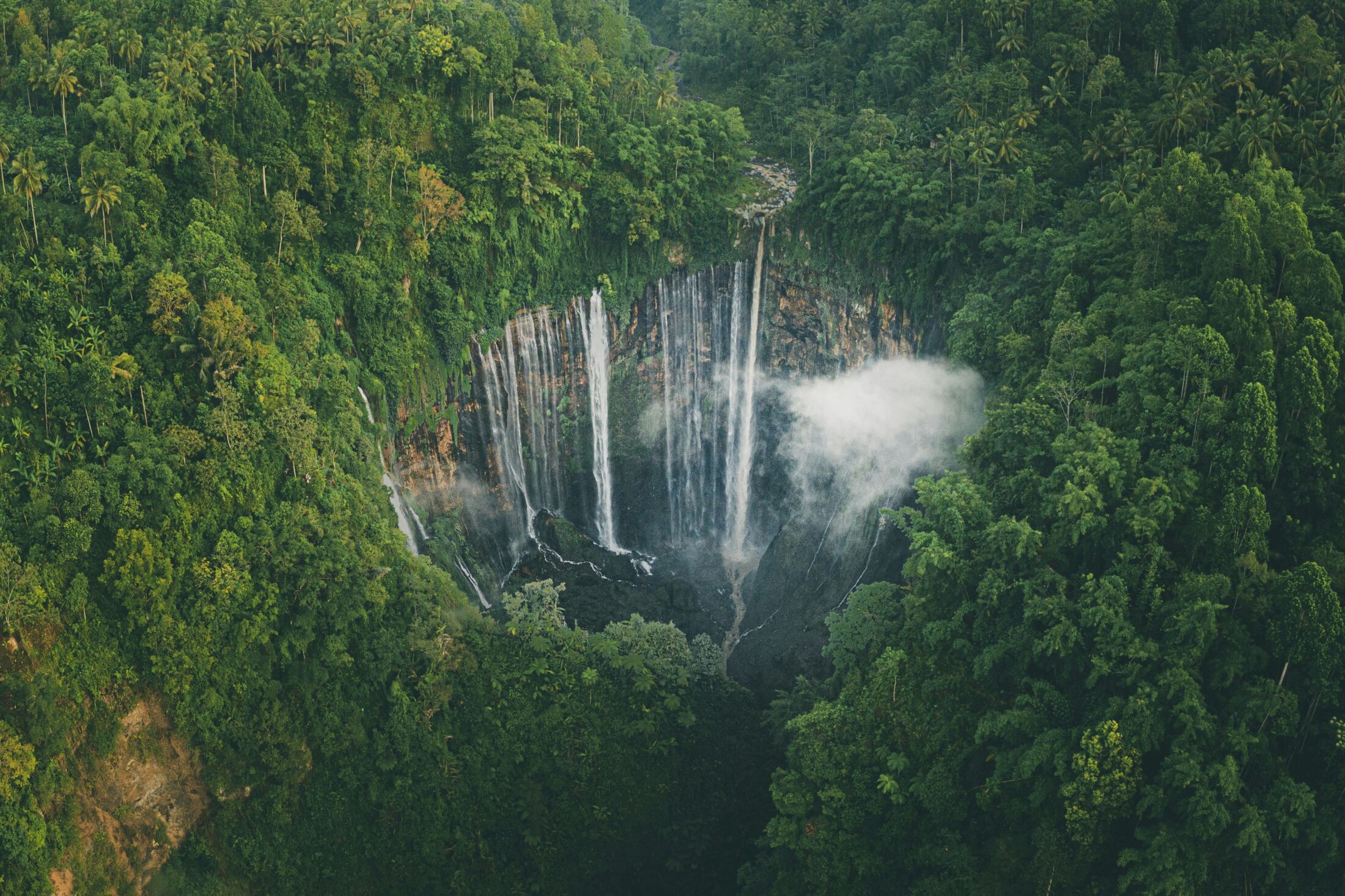 Bywa wręcz uznawany za najpiękniejszy wodospad w całej Indonezji. Powstał na krawędzi dawnej kaldery wulkanicznej, a jego wody pochodzą m.in. ze zboczy potężnego wulkanu Semeru – najwyższego szczytu wyspy. Charakterystyczny półkolisty układ skał sprawia, że dziesiątki strumieni wody spływają równocześnie po ścianach wąwozu, tworząc efekt „tysiąca wodospadów” (stąd nazwa Tumpak Sewu).