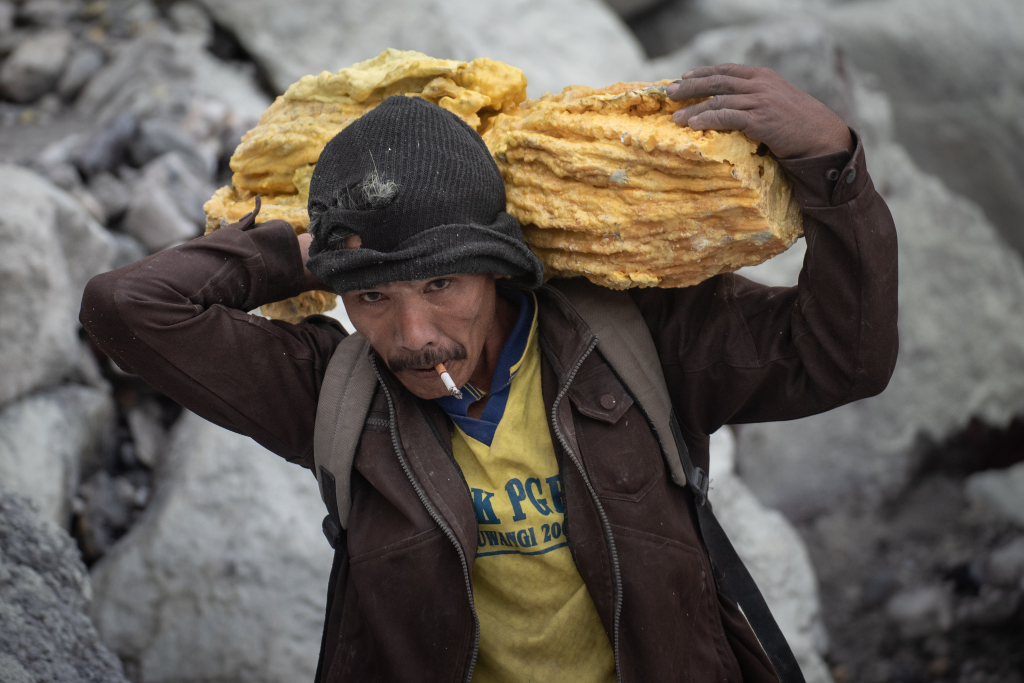 Przy odrobinie szczęścia, podpatrzymy także pracę górników wydobywających siarkę, którzy w ekstremalnych warunkach transportują ciężkie bryły minerału z dna krateru.