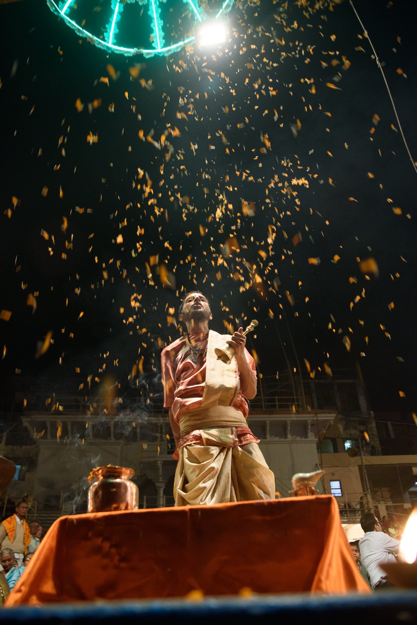 Dzień kończy się rytuałem Aarti (Agni Pooja), kapłani przygotowują ceremonię ku czci ognia. W czasie obrządku modlący się czczą i poświęcają boga Shiwy, świętej Gangi oraz całego wszechświata. Rozpala się ogniste ołtarzyki, które pływają po rzece, rozświetlają Indie i Bangladesz po to, by rano znów tu wrócić.